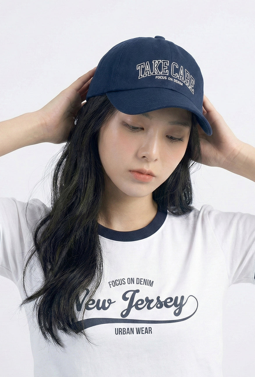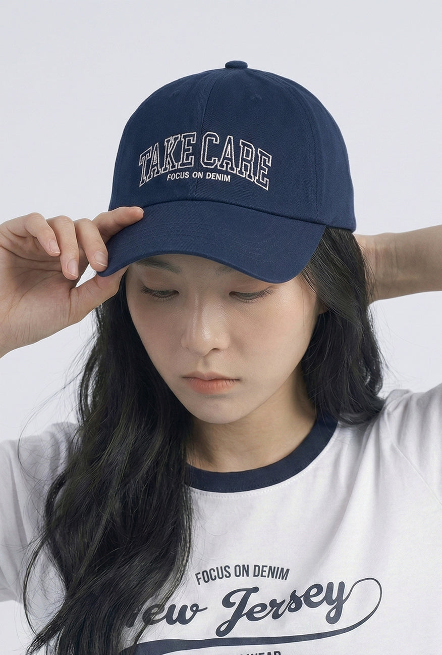 Topi warna navy dengan desain clean yang rapi. Menggunakan siluet klasik dengan embroidery “TAKE CARE” di bagian depan dan Focus on Denim sebagai detail pendamping. Warna navy memberi alternatif yang lebih soft dari hitam, tetap mudah dipadukan untuk pemakaian sehari-hari.