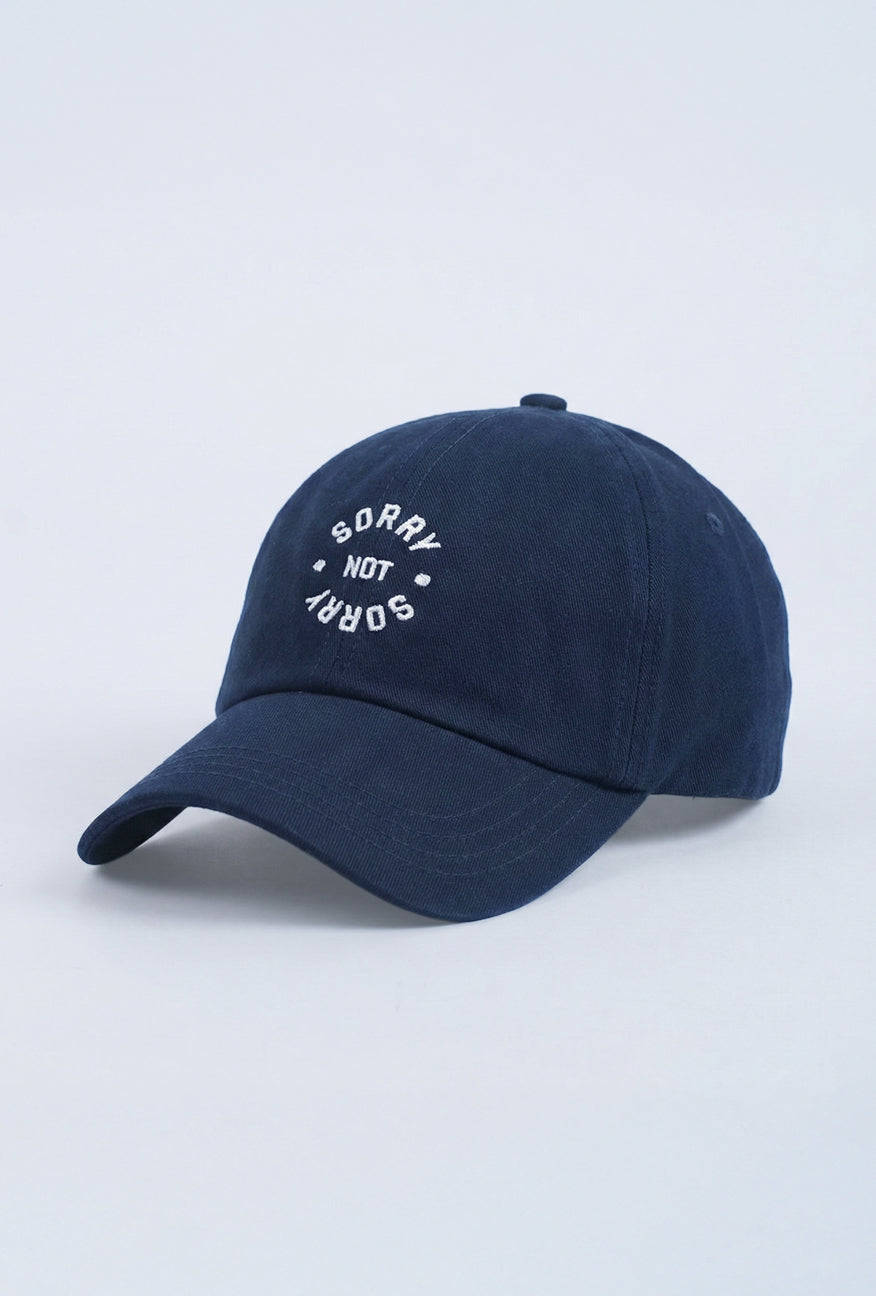 Topi warna navy dengan desain clean dan siluet klasik. Dilengkapi embroidery “SORRY NOT SORRY” di bagian depan sebagai detail grafis yang simpel namun berkarakter. Warna navy memberi tampilan rapi dan mudah dipadukan untuk pemakaian sehari-hari.